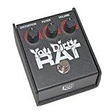 The Pro Co You Dirty Rat, think early punk. Think about the bands that changed the sound of rock n' roll. The You Dirty Rat combines the sound of the garage with the spirit of inovation. The key to the You Dirty RAT is the germanium clipping diodes. Any pedal aficionado will tell you that nothing compares to the warm tone that these sought after components provide. This pedal is the perfect middle ground between distortion and fuzz, combining the characteristic RAT tone with the warmth of a classic fuzztone. The You Dirty RAT also provides 3db more compression than the original RAT. This not only provides more "tube amp warmth", but adds extra sustain. Distortion and Volume controls dial in the perfect amount of gain while keeping the level consistent with your clean tone. While there is no mistaking hte legendary RAT tone when the pedal is on, true bypass switching guarantees that no extra noise will creap into your signal when it's turned off. Read more